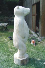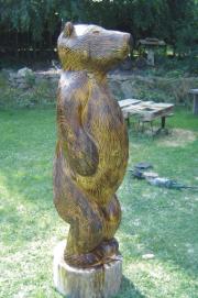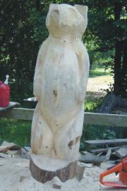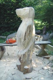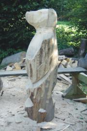 Die FertigungDie Holzskulpturen werden aus ganzen Baumstämmen mit der Motorsäge gefertigt. Bei Fichtenskulpturen erfolgt auf die Motorsägenarbeit die Schleifarbeit. Dazu wird ein Winkelschleifer verwendet.